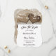 Casamento romântico de países rústicos salve o cartão de data com corações em burlap em um fundo beige hessiano decorado com rendas brancas e luzes de cordas.