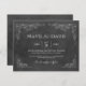Este cartão de anúncio de casamento formal com um design de rótulo de vinho vintage. Esboços rústicos desenhados à mão com uma aparência de giz de folhas de videira enquadram os detalhes importantes. Um monograma simples e ornamentado aparece no verso. Branco / cinza suave em um fundo de quadro negro com aparência texturizada.
