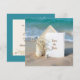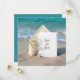 Um cartão de convite de casamento em branco é elegantemente colocado contra um cenário de praia, acompanhado por delicadas flores de gipsófila brancas, uma estrela-do-mar e um dólar de areia.