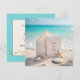 Um cartão e envelope em branco repousam em uma praia arenosa cercada por conchas, uma estrela-do-mar e um fundo de oceano turquesa.