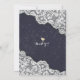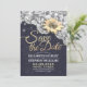 Modelo de Cartão de Convite de Casamento Salve a Data - Girassóis Elegantes, Moldura de Renda Vintage e Luzes de Corda Chiques em Fundo Azul Naval.
