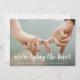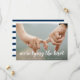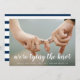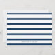 Náutico salve o cartão de data com sua imagem horizontal sangrada do cheio e uma sobreposição de texto com as palavras "estamos casandos" em uma letra branca. Veja abaixo seus detalhes em uma linha de solteiro de texto. A parte de trás tem faixas marinho azul e branca e uma linha de texto para informações adicionais. Um design simples e moderno que faz da sua foto a principal característica.