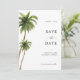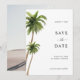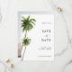 Defina o tom do seu grande dia com este cartão de "guarde a data" de casamento com tema de destino tropical de palmeira na praia. Com palmeiras pintadas à aguarela e um clima exótico de praia, é perfeito para o Havaí, México, Los Cabos, Miami ou qualquer celebração à beira-mar. Uma mistura de caligrafia moderna e charme boêmio o torna ideal para cartões de "guarde a data" de viagem, feriados ou férias - um estilo sem esforço para os seus planos de casamento banhados pelo sol!
