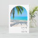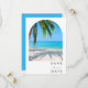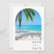 Palmeira tropical, salvem a data do casamento na praia de destino. A frente desta salva da data apresenta uma fotografia de um arco de uma praça tropical pristina, transportando seus convidados para um paraíso tropical. A parte de trás da data de salvamento apresenta uma foto de arco e é personalizada com seus detalhes de casamento.