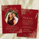 Estas belas cartas são uma forma excelente de deixar seus amigos e família saberem salvar a data do seu próximo casamento. Eles apresentam um criminoso marmoreado vermelho e design dourado com sua foto em um quadro em forma oval cercado por fritos de folha de alumínio de ouro e letras de rico com seus nomes, data de casamento e local. O verso tem um gráfico bonito de "lápis nós in" com espaço para uma nota que pode incluir um site onde seus convidados podem obter mais informações.