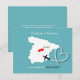 Um divertido save the date para casais que se casam na Espanha continental com um mapa de silhueta branca da Espanha em azul turquesa com corações de amor vermelhos e muito fácil de personalizar com seus nomes e mensagem pessoal
