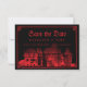 Impressione seus convidados com este cartão de "guarde a data" de casamento gótico. Este cartão clássico apresenta uma ilustração vintage assustadora de um castelo, que você pode substituir por uma imagem do destino onde será casado (de preferência com fundo transparente). Uma tipografia blackletter caligráfica exibe os nomes dos noivos, data e local. Uma borda desenhada à mão envolve o design. A paleta de cores é vermelho sangue sobre preto.