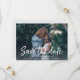 A modern save the date card featuring "save the date" in a fresh and casual handwritten typography style that evokes the look of a brush marker. Designed to accommodate your favorite horizontal or landscape oriented full-bleed engagement photo, this chic card features a white text overlay with your names, wedding date and wedding location. Cards reverse to a subtle ikat pattern with space to include your wedding website url or any additional information you choose.
