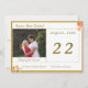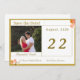 Design apresenta a foto que você fornece como design principal. O título é exibido no canto superior esquerdo em uma fonte dourada contra um fundo retangular branco enquadrado em uma borda fina e ouro. Os nomes da noiva e do noivo são apresentados no mesmo texto dourado contra um fundo branco abaixo da foto. Rosas de cor de pêssego e de terracota melhoram a fronteira. A data do casamento é claramente exibida em grande impressão para se assemelhar a um calendário à direita da foto. Seguindo o formato adequado para o cartão Salvar a data, o nome da igreja junto com a cidade e o estado em que o casamento vai acontecer é mostrado abaixo. Um elegante e cor dourado quadro de borda inteiro de design. Projetado para coordenar com a "Suíte de Casamento Católico de Terracotta".