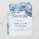 Convite de casamento tema praia com estrelas-do-mar e conchas em aquarela e letras em estilo manuscrito em azul ardósia. Perfeito para temas de oceano, litoral, tropical e náutico. Arte por KL Stock