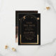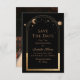 Célestial Black Save The Date Birthday Quinceanera Invitation apresenta um sol dourado, lua e estrelas num fundo preto. Dentro é a sua Quinceanera personalizada para guardar as informações da data e, no verso, adicionar a sua foto favorita. Personalize editando o texto nas caixas de texto. Projetado por ©2024 Evco Studio www.zazzle.com/store/evcostudio