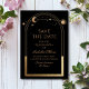 Célestial Black Save The Date Birthday Quinceanera Invitation apresenta um sol dourado, lua e estrelas num fundo preto. Dentro é a sua Quinceanera personalizada para guardar as informações de data. Personalize editando o texto nas caixas de texto. Projetado por ©2024 Evco Studio www.zazzle.com/store/evcostudio