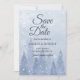 Um "salve a data" com uma cena sonhadora de inverno de pinheiros desbotados e flocos de neve em lindas sombras de azul empoeirado. Mesmerize seus hóspedes com esta gloriosa paisagem de neve. Também está disponível o convite de casamento correspondente e outras essências de casamento.