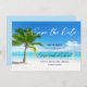 Este tema da praia salva o cartão de visitas mostra uma cena de praia impressionante com água cristalina, areia branca fina e uma bela palmeira. O céu azul intenso e as nuvens espalhadas acrescentam uma vista perfeita de verão. Esta design é perfeita para um casamento de destino, casamento de verão ou casamento de praia.