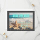 Anúncio de Save the Date moderno e não tradicional com cena de praia (com ondas e estrelas-do-mar na areia) em fundo de fotografia com Save the Date em neon azul aqua. Borda cinza escuro, personalize com detalhes do casal.