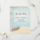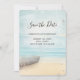 A festa salve o cartão de data com uma bela e tranquila imagem. Cores sutis de azul claro, marrom arenoso e branco suave. Uma cena de praia com um barco na praia e um farol desbotado à distância com pássaros voando ao redor. Um olhar elegante.
