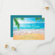 Este cartão Save the Date apresenta uma bela cena de praia com areia, ondas, galhos de palmeiras nos cantos e o horizonte. Este design tropical é perfeito para um Casamento de Sumer, Casamento de Praia, Casamento de Frente Oceânica ou Casamento de Destino. As cores são brilhantes, mas tranquilas, e a cena relaxante complementa o texto elegante.