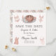 Este encantador Save the Date define o tom para um chá de noiva de lingerie e cafés, apresentando lingerie de casamento elegante, um café aconchegante e flores boho em um design elegante. O verso apresenta um padrão caprichoso de bolos de casamento, peças delicadas de lingerie, flores e muito mais.