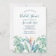 Chá de panela tropical chic apresenta uma borda inferior de florais de aquarelas com folhagem botânica e verde-limpas. Personalize com os detalhes do seu chá de panela no moderno roteiro escrito à mão e no sans serif lettering. Convites invertendo para verde marinho azul rico. Perfeito para chás de panela de verão, destino ou praia ou brunch. Para ver mais designs como este, visite www.zazzle.com/vginvites