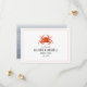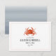 Um convite de casamento rústico náutico "save the date" apresentando uma ilustração de um caranguejo vermelho com texto cinza e listras vermelhas desbotadas na frente. O verso apresenta um design inspirado em chambray com aquarela.