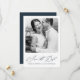Elegante caligrafia e parte de trás do cartão em azul escuro foto cartão de casamento save the date.