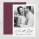 Elegante cartão de save the date de casamento com caligrafia e foto na parte de trás.