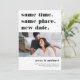 Precisa adiar ou remarcar o seu casamento? Informe os convidados com esses cartões modernos e alegres em branco com letras ricas em preto. Design engraçado e inteligente baseado em tipografia apresenta "mesmo horário, mesmo local, nova data" no topo com a nova data do casamento e detalhes abaixo. Personalize com uma foto e adicione detalhes adicionais no verso.