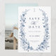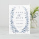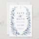 This elegant photo save the date card features soft dusty blue botanical florals arranged in a graceful wreath, paired with refined typography for a timeless winter aesthetic. The back showcases a personalized photograph, blending romantic storytelling with classic design. Inspired by vintage botanical artwork and cool icy tones, this sophisticated announcement is perfect for formal, traditional, and luxury winter weddings, offering a polished first glimpse of your celebration.