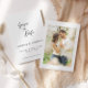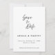 Um simples clássico anúncio de casamento com foto em preto e branco para salvar a data. Este cartão de salvar a data apresenta um texto com letra cursiva elegante com um tema simples em preto e branco e uma foto no verso. Personalize o texto com todos os detalhes do seu dia especial.