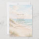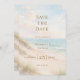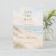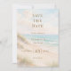 A watercolored sandy beach, sand dunes, ocean waves background. Personalize and add a date and your names. The text: Save the Date is written with a large trendy hand lettered style script.