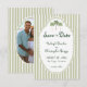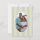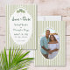 This whimsical coastal wedding photo save the date features a lace border, palm trees, and stylish sage green stripe background. Perfect for a beach or California destination wedding. Your photo is framed in a whimsical lace frame on the back. Created by Simply Farmhouse Press.