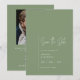 Um simples casamento verde de sábio moderno salva o anúncio da data. O título "save the date" (salvar a data) em caracteres brancos modernos manuscritos. Ao contrário, adicione sua foto e seu site de casamento, completo com o código QR.