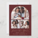 Este simples e minimalista Cartão Salvar a Data apresenta um arco de colagem de 3 fotos acima das palavras "Salvar a Data" em um elegante guião de manuscrito dourado, seguido pelos nomes do casal, data do casamento e cidade em sans serif em um fundo vermelho burgundy. Adicione uma mensagem mais detalhada com informações adicionais sobre o inverso, juntamente com um código QR para ajudar seus convidados a visitar seu site de casamento.