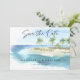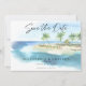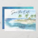 Anúncio de Save the Date de casamento na praia do oceano tropical moderno - Anuncie a data do seu casamento com nosso convite de casamento com tema de praia tropical em aquarela, apresentando uma cena de praia tropical em aquarela linda. Uma praia arenosa quente com água turquesa e palmeiras decoradas com luzes de corda com tipografia de roteiro moderno. Inclui código QR para você personalizar com o URL do site do seu casamento.