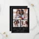 Este simples e minimalista Cartão Salvar a Data apresenta uma colagem de 3 fotos acima das palavras "Salvar a Data" em um elegante guião branco, seguido dos nomes do casal, da data do casamento e da cidade em sans serif em um fundo preto. Adicione uma mensagem mais detalhada com informações adicionais sobre o inverso, juntamente com um código QR para ajudar seus convidados a visitar seu site de casamento.