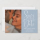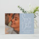 Este convite de casamento com grafia elegante em azul poeirento pode ser personalizado com suas duas fotos especiais, informações do dia do casamento e código QR do site do casamento. Criado por Thisisnotme©
