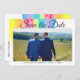 Belo casamento do arco-íris Salve a data com traçados bonito e artísticos de cor brilhante sobre sua foto de noivado LGBT. Estas cartas coloridas são perfeitas para um casal artístico ou um casamento de gay e lésbicas. Adicione seu site ao código QR na parte traseira para dar aos convidados o link para o seu site de casamento.