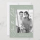 Anuncie seu casamento com este moderno e elegante cartão de data, projetado para cativar seus hóspedes com seu charme de eterno. "Save the Date" é apresentado verticalmente no lado esquerdo em caligrafia branca graciosa contra um fundo verde de calcanhar, criando uma estética sofisticada e natural. Sua foto vertical do noivado está perfeitamente posicionada à direita, adicionando um toque pessoal e na moda ao design. Personalize o cartão com seus nomes, data do casamento e local em letras brancas em negrito para um olhar elegante e coeso. A parte traseira do cartão inclui espaço para uma foto adicional, juntamente com o site do seu casamento e um conveniente código QR para compartilhar sem esforço os detalhes do evento. Perfeito para casais que buscam um anúncio simples, mas refinado, este design dá o tom para uma celebração verdadeiramente memorável.