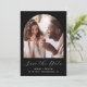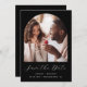 Este simples e minimalista Cartão Salvar a Data apresenta um boho de fotos acima das palavras "Salvar a Data" em um elegante roteiro de manuscrito branco, seguido pelos nomes do casal, data do casamento e cidade em sans serif em um fundo preto. Adicione uma mensagem mais detalhada com informações adicionais no verso, juntamente com um código QR que envia convidados para o seu site de casamento.