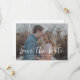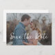 Um moderno e casual salva o anúncio da data com sua foto horizontal/paisagem favorita sobreposta com "salve a data" em letra casual branca moderna, escrita à mão. A cor disto é editável. Personalize ainda mais adicionando detalhes do seu site de casamento com um código QR no sentido inverso.