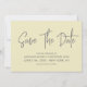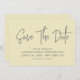 A caligrafia moderna salva a data em amarelo-claro com texto de cinza e um código QR digitalizável para um site ou informações de contato no verso.
