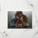 Elegante e na moda salve o cartão de data com um texto de sobreposição de tipografia que diz "salve nossa data" com sua foto horizontal. Você pode adicionar um código QR na parte traseira que liga ao seu site de casamento.