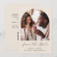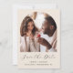 Este simples cartão de Save the Date minimalista apresenta um arco de foto boho acima das palavras "Save the Date" em elegante letra manuscrita branca, seguido pelos nomes do casal, data do casamento e cidade em fonte sans serif em um fundo bege. Adicione uma mensagem mais detalhada com informações adicionais no verso, juntamente com um código QR que envia os convidados para o site do seu casamento.