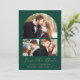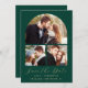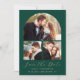 Este simples e minimalista Cartão Salvar a Data apresenta um arco de colagem de 3 fotos acima das palavras "Salvar a Data" em um elegante guião de manuscrito dourado, seguido pelos nomes do casal, data do casamento e cidade em sans serif em um fundo verde esmeralda. Adicione uma mensagem mais detalhada com informações adicionais na parte traseira, juntamente com um código QR para ajudar seus convidados a visitar o site do seu casamento.