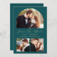 Este simples e minimalista Cartão Salvar a Data apresenta um arco de fotos personalizado acima das palavras "Salvar a Data" em um elegante roteiro de manuscrito dourado, seguido pelos nomes do casal, data do casamento e cidade em sans serif em um fundo azul teal. Duas fotos quadradas menores aparecem na parte inferior do cartão. Adicione uma mensagem mais detalhada com informações adicionais na parte traseira, juntamente com um código QR para ajudar seus convidados a visitar o site do seu casamento.