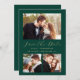 Este simples e minimalista Cartão Salvar a Data contém uma foto horizontal acima das palavras "Salvar a Data" em um elegante roteiro de escrita manual dourada, seguido pelos nomes do casal, data do casamento e cidade em sans serif em um fundo verde esmeralda. Duas fotos quadradas menores aparecem na parte inferior do cartão. Adicione uma mensagem mais detalhada com informações adicionais na parte traseira, juntamente com um código QR para ajudar seus convidados a visitar o site do seu casamento.