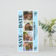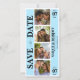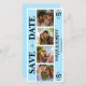 Casamento azul salve o cartão de data com a cabine fotográfica chamada colagem. Personalize com seus detalhes pessoais de casamento e novas fotografias de casal.