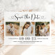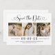 Casamento preto-e-branco moderno salva os cartões de aviso de data apresentam uma colagem de três fotos de noivado quadrado e um design de tipografia na moda-preta com roteiro de caligrafia e sotaque cardíaco. O texto personalizado simples e elegante que pode ser completamente personalizado com a data numérica do casamento, nomes de noivas e noivos, local da cerimônia, site do casamento e convite formal para seguir a redação.