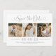 Cinza prateada moderna e casamento branco guardem os cartões de aviso de data e apresentam uma colagem de três fotos de noivado quadrado e um design de tipografia de na moda com roteiro de caligrafia e sotaque cardíaco. O texto personalizado simples e elegante que pode ser completamente personalizado com a data numérica do casamento, nomes de noivas e noivos, local da cerimônia, site do casamento e convite formal para seguir a redação.