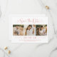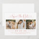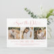 Rosa ouro moderno e casamento branco salvam os cartões de anúncio de data e apresentam uma colagem de três fotos de noivado quadrado e um design de tipografia de na moda com roteiro de caligrafia e sotaque cardíaco. O texto personalizado simples e elegante que pode ser completamente personalizado com a data numérica do casamento, nomes de noivas e noivos, local da cerimônia, site do casamento e convite formal para seguir a redação.